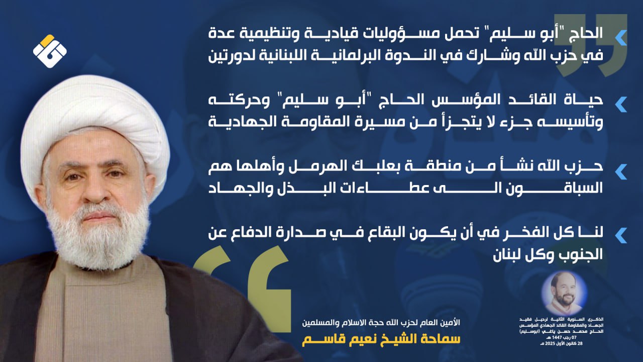وصف الشيخ قاسم الحاج “أبو سليم” بأنه أخ عزيز وحبيب من الجيل المؤسس وموضع ثقة سيد شهداء الأمة، السيد حسن نصرالله (قده)، مؤكداً أن حزب الله نشأ من منطقة بعلبك – الهرمل، حيث كان أهلها السباقين إلى عطاءات البذل والجهاد.