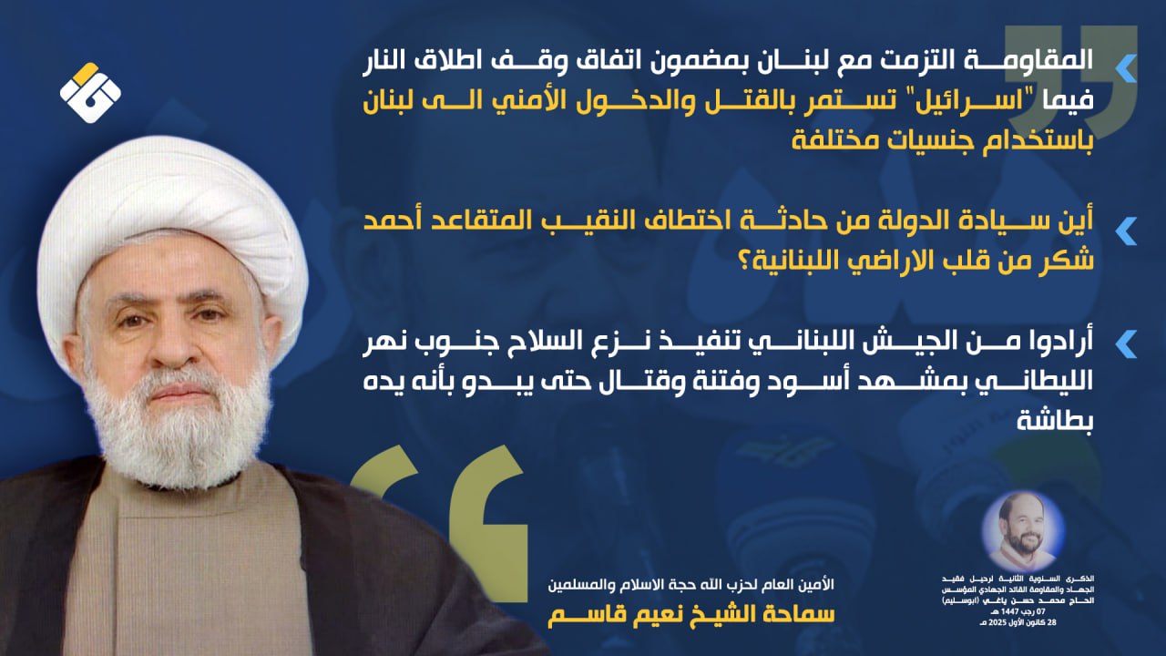 وتساءل الشيخ قاسم عن سيادة الدولة من حادثة اختطاف النقيب المتقاعد أحمد شكر من قلب الأراضي اللبنانية، معتبراً أن محاولة إلزام الجيش اللبناني بتنفيذ “نزع السلاح” جنوب نهر الليطاني كانت تهدف إلى خلق مشهد أسود من الفتنة والقتال، لإظهار الجيش وكأنه ضعيف.