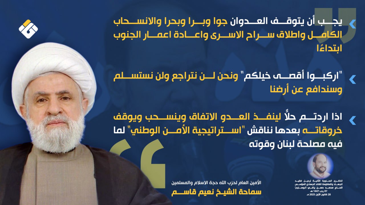 وشدد الشيخ قاسم على أن الدولة اللبنانية ليست مسؤولة عن أن تكون شرطياً للعدو الإسرائيلي، داعياً إلى وقف العدوان جواً وبراً وبحراً، والانصراف نحو الانسحاب الكامل، وإطلاق سراح الأسرى، وإعادة إعمار الجنوب أولاً.