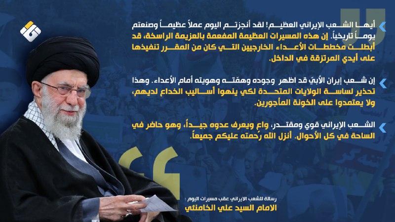 أيّها الشعبُ الإيرانيّ العظيم الشأن! لقد أنجزتم اليوم عملاً عظيمًا، وسطّرتم يومًا تاريخيًّا. إن هذه الحشود الغفيرة المفعمة بالعزيمة الراسخة، قد أبطلت مخططات الأعداء الأجانب التي كان من المقرر تنفيذها على أيدي المرتزقة في الداخل.