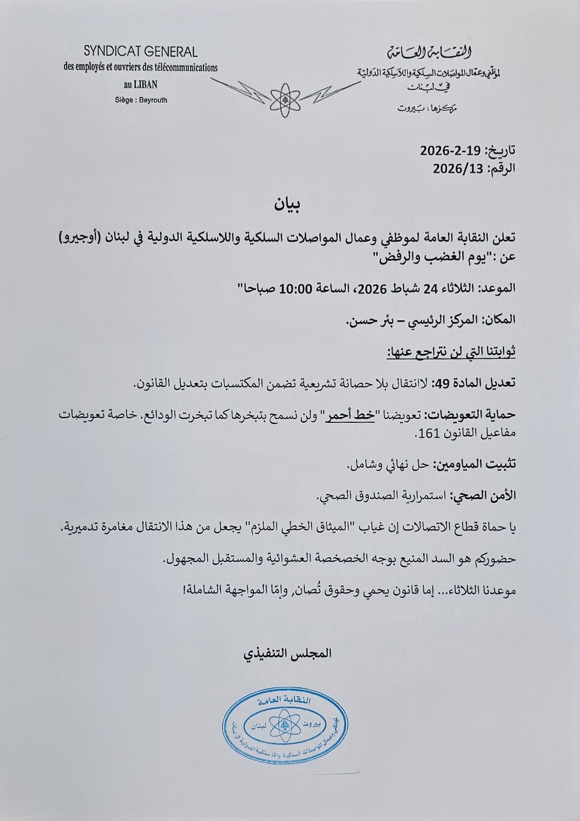 أعلنت النقابة العامة لموظفي وعمال المواصلات السلكية واللاسلكية الدولية “أوجيرو” أن يوم الثلاثاء 24 شباط هو “يوم الغضب والرفض”، على أن يتمّ التجمع عند العاشرة صباحاً في المركز الرئيسي – بئر حسن.